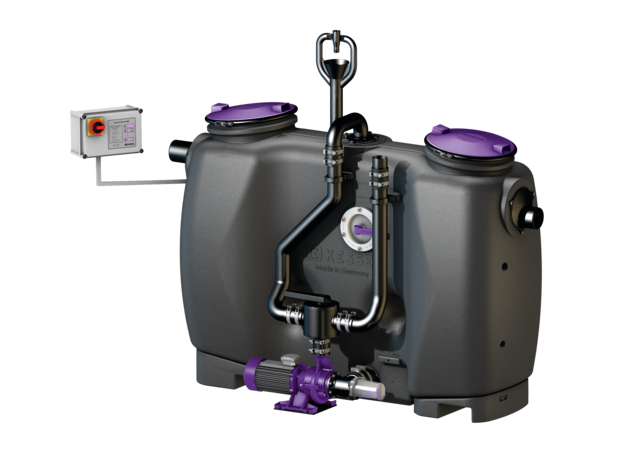 Kessel NS 7 fedtudskiller. Mix og Pump M+S betyder, at der ikke er nogen lugtgener under tømning og rengøring af fedtudskilleren. Rengøring kan foretages med koldt vand, da pumpen cirkulerer og kværner indholdet i tanken - også ved tømning til slamsugeren.