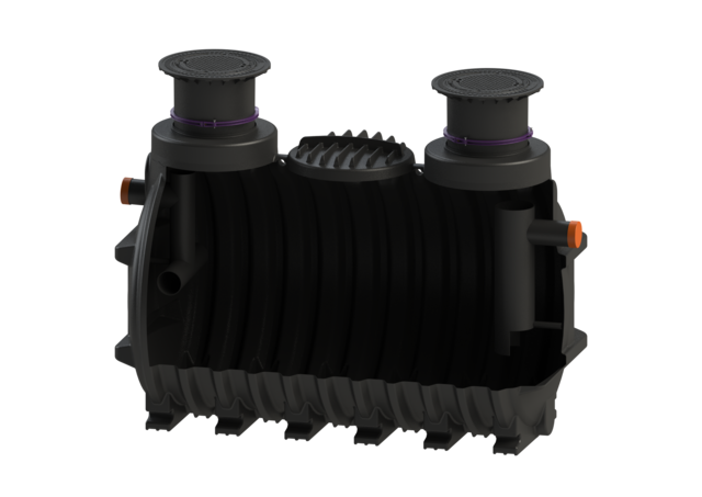 Fedtudskiller til nedgravning, fremstillet i PE-HD med integreret slamfang. Leveres med teleskopisk justerbare forhøjerstykker, der kan vinkles i 5° samt 2 lugttætte og låsbare dæksler, der er trafiksikre op til kl. B 125 (12,5 tons). Til- og afløb i Ø200 mm.