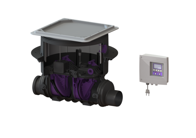 Højvandslukke type 3 til fækalieholdigt spildevand, med to klapper, hvoraf en klap kan tvangslukkes med håndkraft som en nødlukning og den anden er motorstyret. Kontrol/alarmboks med display til drifts-status og batteri-backup, sikringstype IP54 med integreret SDS selvdiagnosesystem til installation i betondæk/gulv, som typen KESSEL Staufix FKA Komfort DK fra Lauridsen Handel & Import A/S.