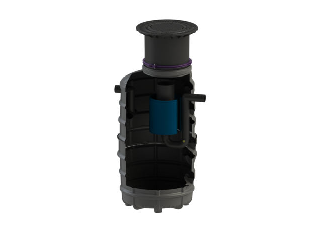 Koalescensudskiller produceret af polyethylen PE-HD med integreret slamfang og automatisk flydelukke. Koalencensfilteret kan udskiftes eller rengøres. Forhøjerstykket af PE-HD er teleskopisk justerbar. Kan vinkles i 5°.