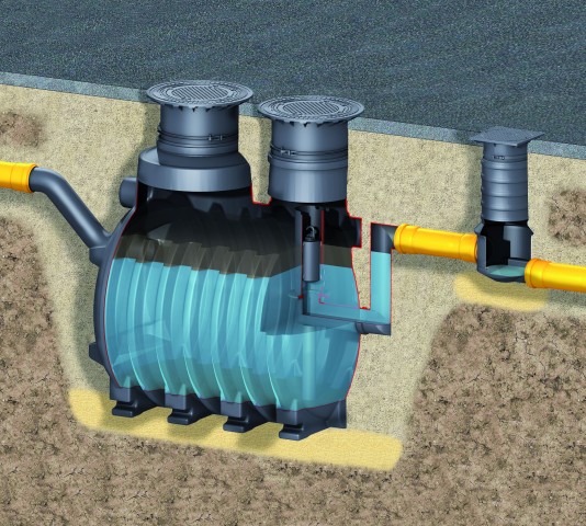 Olie-/benzinudskiller produceret af polyethylen PE-HD med integreret slamfang og automatisk flydelukke. Forhøjerstykket af PE-HD er teleskopisk justerbar. Kan vinkles i 5°.