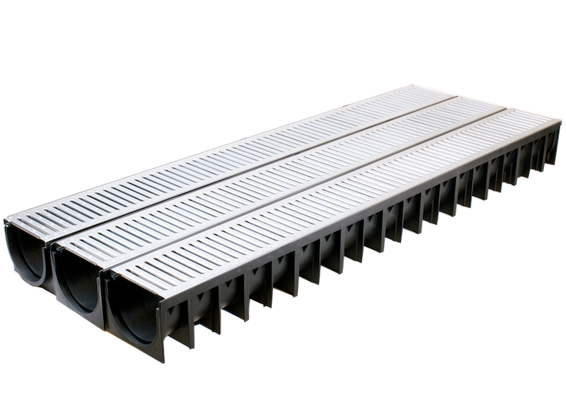 Afvandingskit bestående af 3 stk. riste i galvaniseret stål, 3 stk. afløbsrender, 2 stk. endegavle og 1 stk. udløbsstuds. Belastningsklasse A (1500 kg). Velegnet til anvendelse foran garager og carporte i indkørsler.