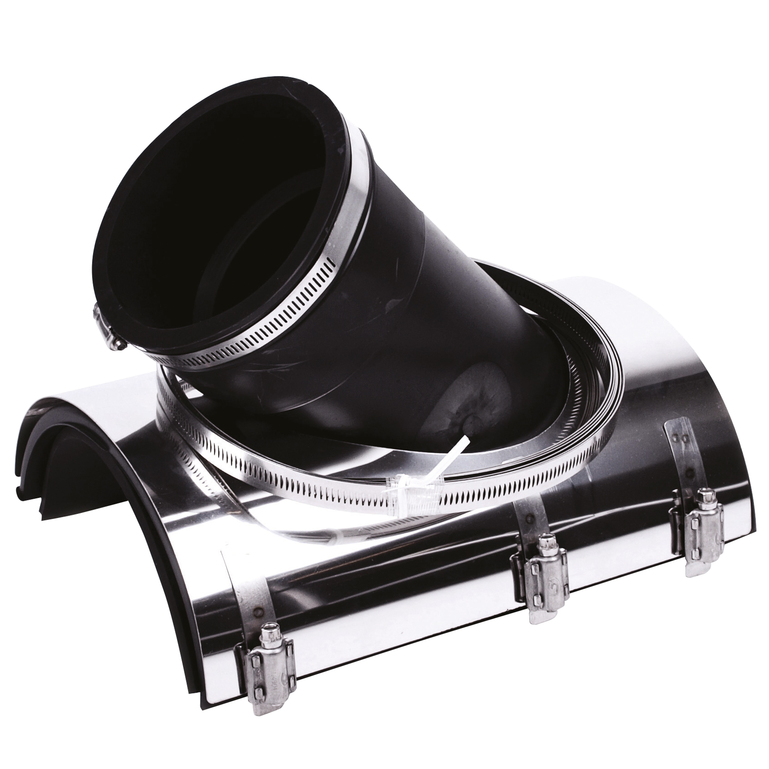 45° tilslutninger af glatte plastrør eller lignende udføres med sadelgrenrør, som typen med syrefast rustfrit stålsvøb og spændebånd fra Lauridsen Handel & Import A/S.