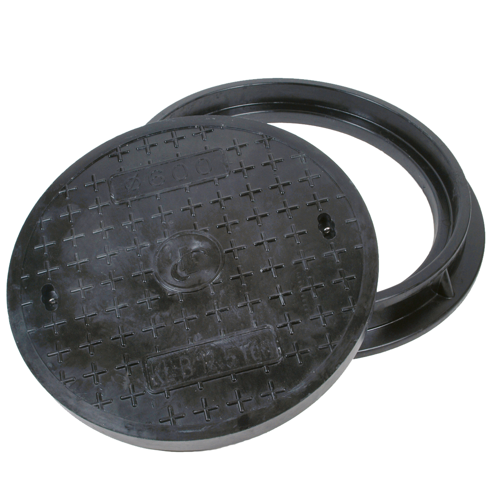 Rund letvægtsdæksel og karm af glasfiberarmeret polyester klasse B (12,5 tons), med indlagt stålarmering og med nedsænkede øjebolte, som typen letvægtsdæksel og karm fra Lauridsen Handel & Import A/S.Specifikationer
